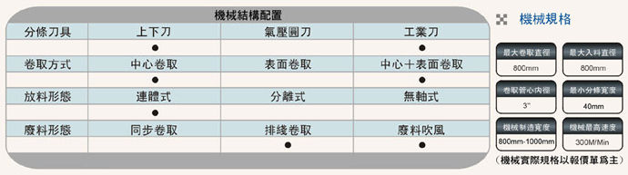 成品卷取方式:可配備板條式氣壓軸及滑差式卷取軸,適用更廣范圍,換軸方式經(jīng)特殊設(shè)計,可以隨時更換。